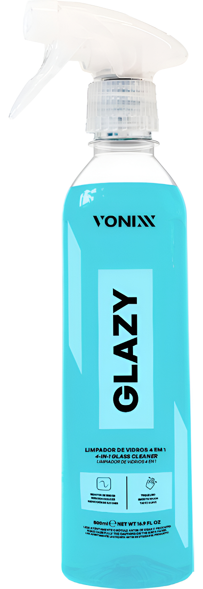 GLAZY 500ML LIMPADOR DE VIDROS 4 EM 1 GLAZY é um produto 4 em 1, de alta tecnologia, desenvolvido para vidros em geral, que limpa, protege, condiciona e atua como redutor de riscos. O produto contém polímeros especiais que reduzem o atrito no vidro, diminuindo as chances de riscos causados por limpadores de para-brisas e movimentações dos vidros laterais. Deixa um toque liso e aspecto de vidro novo toque liso. MODO DE USO: 1 - Pulverize uma pequena quantidade do produto diretamente nos vidros; 2 - Espalhe rapidamente o produto utilizando uma microfibra específica para vidros. 3 - Vire a microfibra ou utilize uma segunda microfibra limpa e seca para dar acabamento até concluir o processo. 4 - Se necessário, repita a operação.